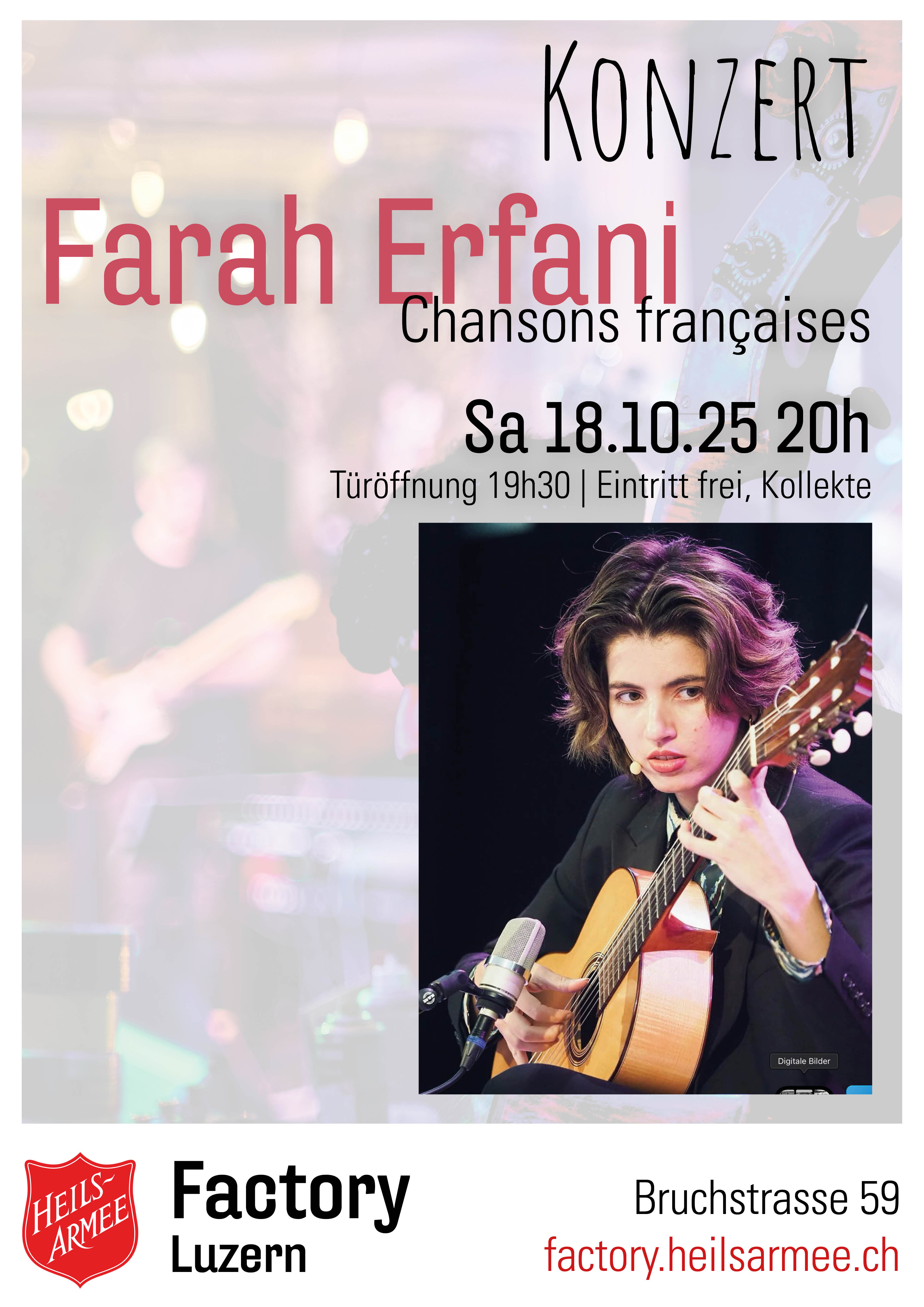 Farah Erfani singt von der Nostalgie einer Zeit, die sie nicht gekannt hat und fesselt das Publikum mit eigenen Liedern sowie edlen Covers von Chanson-Klassikern. Farahs sanfte tiefe Stimme -umrahmt von ihrer spanischen Gitarre- lädt dazu ein, sich ganz einzulassen auf die authentisch und differenziert vorgetragenen Chansons. Berührt von der intimen Qualität der Lieder ihres Vorbilds Serge Gainsbourg, liebt Farah Eleganz bei Texten und Melodien; sie ist fasziniert von seinen Wortspielen und Klängen voller Schattierungen, als Gegenpol zur Hektik der modernen Welt. Nicht zu verkennen ist, dass Farahs Ausbildung als klassische Musikerin einen weiteren Einfluss bringt, der mal an Chopin, mal an Piazzolla erinnert. Seit 2023 tritt sie regelmässig in der ganzen Schweiz, in Deutschland und in Frankreich auf. Die „Emérgences musicales de Montreux“ wurden 2024 auf ihr Talent aufmerksam und wählten sie aus, um an einer einwöchigen, gecoachten Musikresidenz in Montreux teilzunehmen. Da lernte sie bedeutsame Persönlichkeiten der französischen Chansons wie Francis Cabrel, Diane Tell, Cali und Anne Sila kennen.